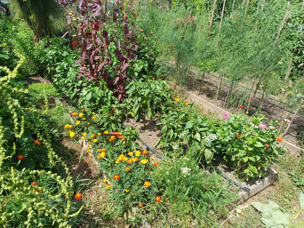 Nyilván az, hogy magunkat valamennyire ellássuk és úgy gondolom, hogy zöldségfélékben például, mondjuk a krumplit kivéve, gyakorlatilag szezonban meg tudom termelni a szükséges mennyiséget. Emellett beillesztettem a biointenzív kertészeti módszert, ami sokkal hatékonyabb, mint a hagyományos módszerek. Eltenni nem annyira tudok, talán céklát, esetleg uborkát, de ez nem is annyira cél. A gyümölcstermesztés még kezdeti fázisban van, de bogyós sövényt ültettem a kerítés mellé, ahol nagyon sokféle szeder, málna stb. van, és azok sikeresek. Szárazságban persze nem annyira, ilyenkor kicsit öntözni kell. A fák esetében genetikailag törpéket választottam, amik max. 2 m magasra nőnek. Ezekből több mint 20 féle fám van.